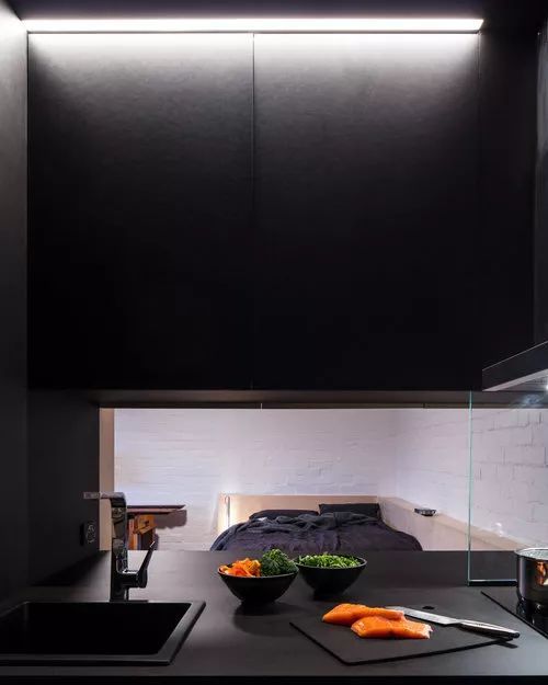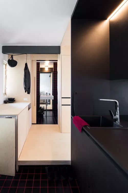 很多公寓都是一进门就是厨房的户型,打造与隔墙同样颜色的黑色橱柜,简单而实用的操作台,一个人住足够用了。