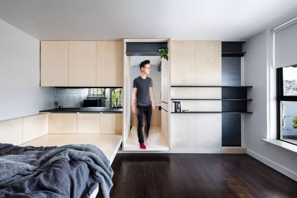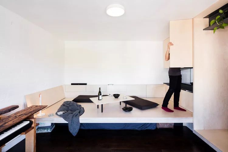 将床垫收进床板下,拿出了小桌板,这里既可以是就餐区域,也可以是喝茶小酌的地方。不得不说,这样起居室,谁都不会拒绝。