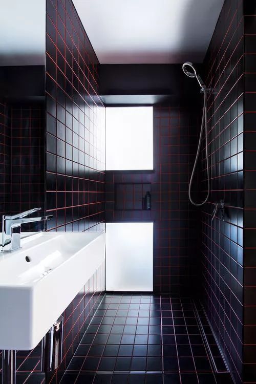 在过道的尽头就是卫生间,卫生间的墙地面与玄关地面一致,黑色系的布局让整个空间神秘感十足。