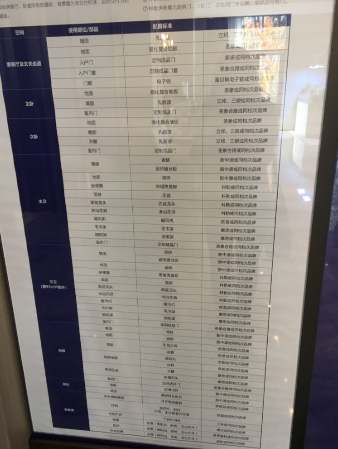 此前,江苏房地产金融实探和峰南岸时,看到案场对外公布了93、115㎡样板间,并张贴了精装标准: