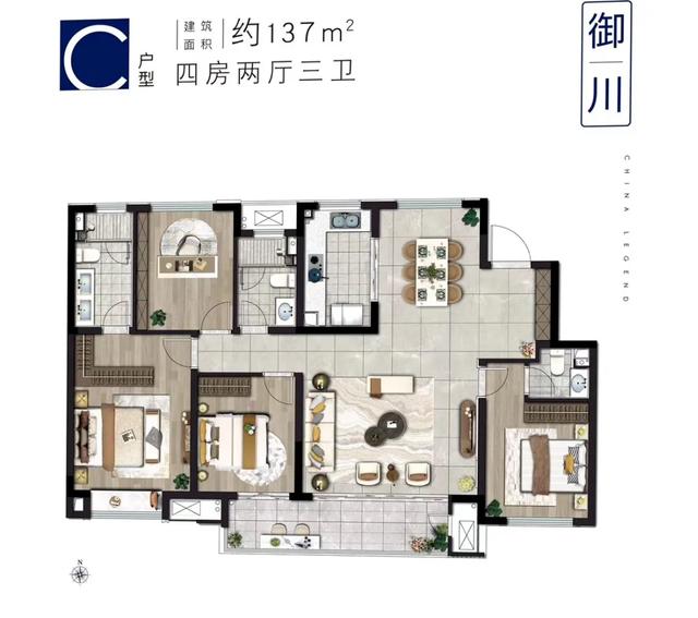 约228㎡做成了四房两厅三卫,四开间朝南、大横厅设计↓