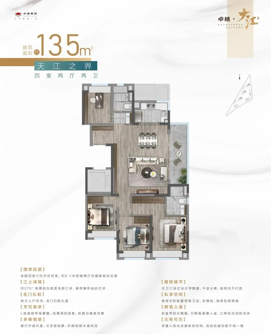 上周,卓越大江正式公开105、135㎡户型样板间,其中105㎡打造三房两厅两卫,135㎡为四房两厅两卫设计,从户型看,卓越大江体量虽小,但还是想吸引一部分高净值人群的。项目预计11月底首开推出所有房源,而且很可能8成首付。