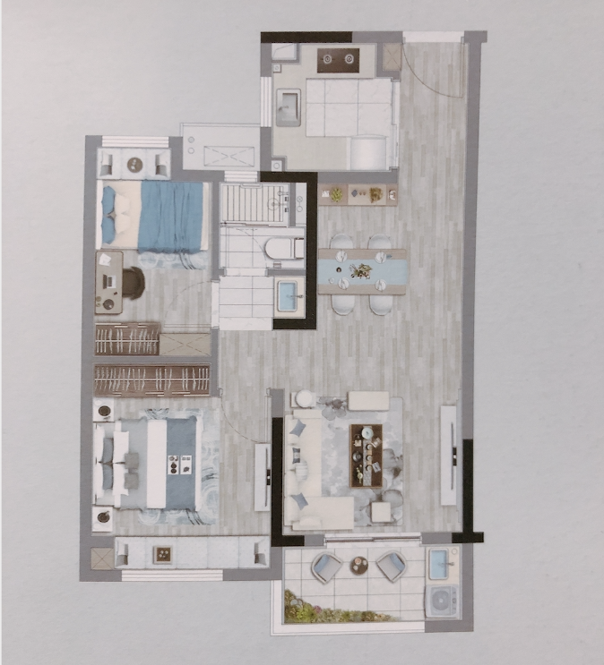 这个户型在公开时也吸引了不少买房人的目光,大横厅双阳台设计,看江视野很棒,此外厨房还设计了L型观景窗,三开间朝南,采光通风俱佳。