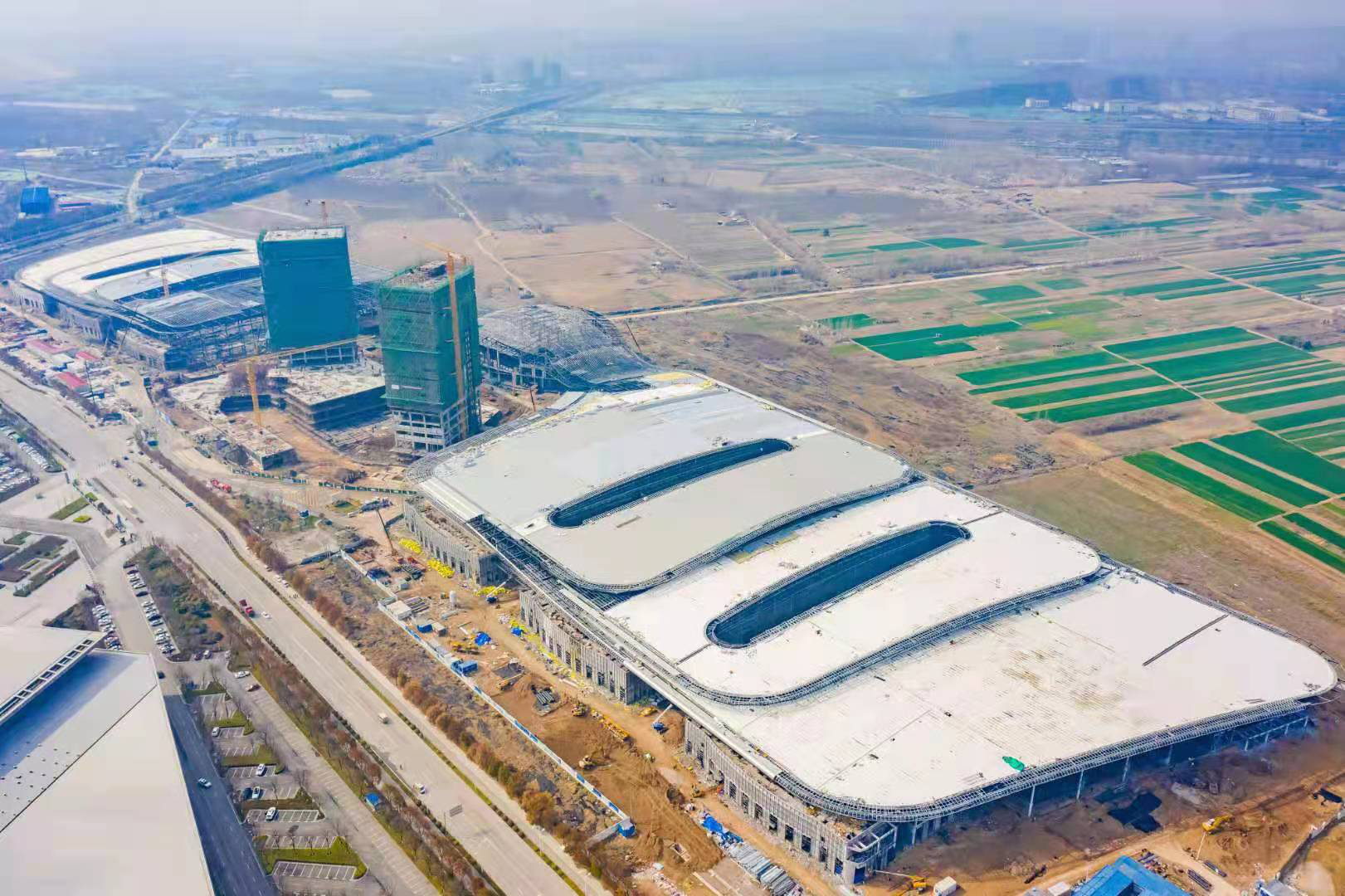 淮海国际博览中心于2019年9月开工建设以来,徐州市委市政府、云龙区委区政府等各级领导高度重视,多次莅临项目现场,对项目建设给予大力支持;绿地集团领导始终关心关注项目建设进展,多次深入项目指导工作。项目团队也正戮力同心、攻坚克难,制定了一系列抢工措施,与各参建单位逐项落实施工计划、时间节点,每日现场1500余名工人24小时不间断施工,保障工程项目顺利推进。目前,东展厅室内地面已完成, 外立面幕墙龙骨全部完成,金属屋面即将完工,幕墙玻璃北立面开始安装,序厅装修满堂架搭设完成,功能房间开始吊顶龙骨施工;中央登陆厅主体工程完成,屋面钢檩条完成,一层消防水系统水管安装完成,二层机电已完成,装饰已封板。项目建设预计5月底完成,6月进行场馆调试和交付移交工作,7月1日顺利举办首展活动。