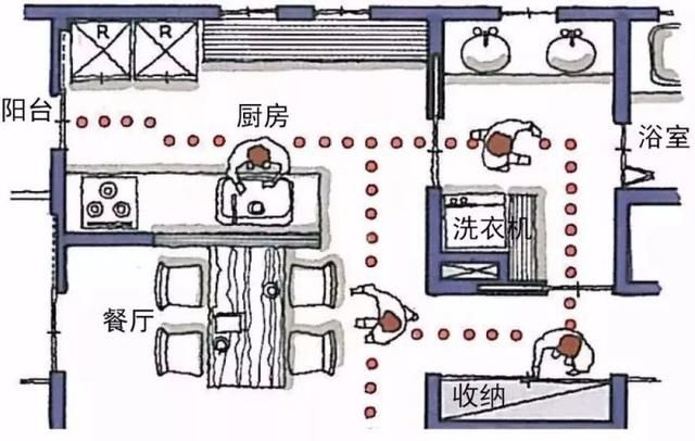 ● 活动比较频繁的的区域应当尽量集中在一起,比如做饭一整套的活动(家务动线):
