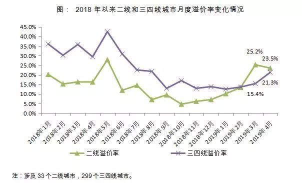 继二线城市溢价率在3月份突破25%,创下2018年下半年以来新高之后,三四线城市溢价率也结束了半年之久的低位徘徊,在4月份迎来了明显回暖,溢价率增至21.3%,较年初上涨了近10个百分点。