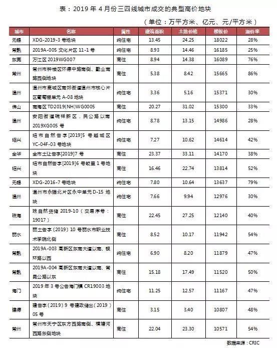 此外,4月4日,无锡滨湖区新四院北侧XDG-2019-3号地块通过摇号产生了得主,融创以楼面限价18000元/㎡ ,总价24.22亿元最终揽获地块,这一楼板价较无锡历史最高价仅低50元/平方米,此类情况不胜枚举,逐渐推高了三四线城市的土地市场热度。