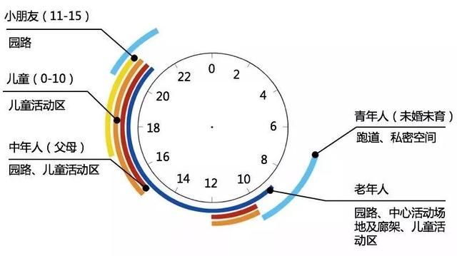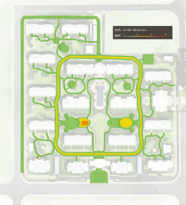 上海融创为了搞清楚自己设计的社区,到底是不是真的满足了客户的需求,就对已经入住的小区做了详细的调研,每个小时对小区的人流变化进行统计,并且形成了全天的人流量热力图。