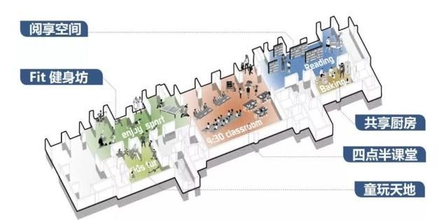 ● 场地营造维度:增加更多的功能主题空间,如阅享空间、童玩天地、Fit健身坊、四点半课堂、共享厨房。